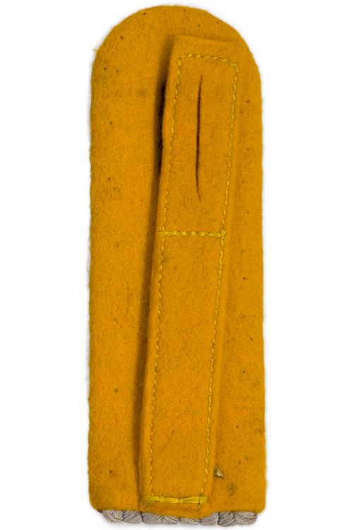BACKGROUND: Although military ranks and rank designations can be traced back to the mercenary armies of the 17TH century it wasn’t until the creation of standing armies in the early 18TH century that distinguishing insignia of rank began to be developed. Originally the shoulder straps were functional items designed to secure the saber and ammunition shoulder cross straps and the larger, metal trimmed epaulettes were a throw back to the protective shoulder pieces worn on medieval armor. By 1800 the epaulettes had lost their protective function and were retained as a badge of rank. In 1866 a new system of rank distinguishing Officer’s shoulder boards were introduced to replace the previously worn epaulettes although the epaulettes were retained for the parade and dress uniforms. Although the officer’s shoulder boards underwent numerous minor modifications they remained basically the same right up until the end of WWII. The different branches of service within the German army were allocated a specific identifying waffenfarbe, (Branch of Service Color), which was displayed as the base on the shoulder boards with golden yellow being chosen for Kavallerie, (Cavalry) personnel.