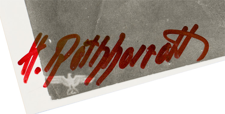 A 10.5cm x 15cm modern printed photograph with post war signature in marker to the bottom front.