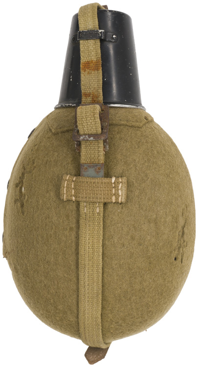 BACKGROUND: Introduced in 1931 the standard issue M31 canteen was based on the WWI M1893 and M1907 canteens with minor modifications. Originally the M31 canteens were manufactured in aluminum but later as the aluminum was required for other more critically essential items the canteens began to be manufactured in steel. In late 1940 with the impending German entrance into the North African campaign the standard brown felt cover and leather retaining straps and carrying harness of the M31 canteen were altered to an olive drab felt cover and web straps for longer wear in the tropical climate. Another variant, developed in late 1941, was the replacement of the felt covers with a plastic impregnated wood covering for better durability. When issued the canteens came with an integral carrying straps and harness and regulations prescribed the assorted manners in which the canteen was to be carried with the most common form being to secure it to the bread bag suspended from the load carrying waist belt although other methods were also utilized. With potable fluids being such an essential item for an individuals well-being the canteen must be considered as a very important piece of personal kit. Of Note: The M31 canteens with tropical olive drab felt cover and web strap configuration were eventually issued to personnel on the continent as leather stocks were depleted during the war.