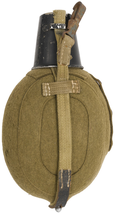 PHYSICAL DESCRIPTION: Tropical issue. Slightly larger size than the normal M31. Complete cover, straps and cup. Maker marked "VAL 43". Clip is a bit rusted and does not close properly. Few small moth holes in the cover. Shows the expected period use and wear.