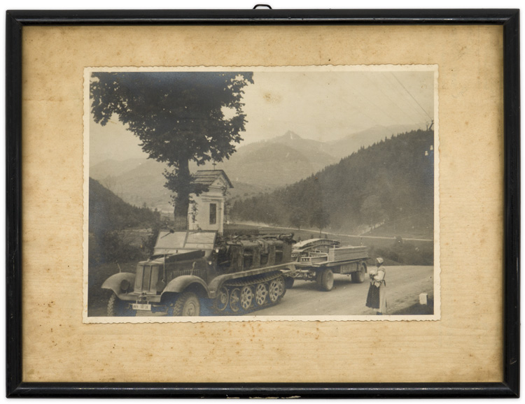 The Sd.Kfz. 9 (Sonder-Kraftfahrzeug 9 - Schwerer Zugkraftwagen 18 t) was the heaviest half-track vehicle of the German Wehrmacht. During World War II, it was primarily used as a prime mover for the heavy artillery pieces of the army, as well as for towing and recovery. This photo shows an artillery tractor with benches and space for ready ammunition, pulling a trailer and bridge components in the mountains.