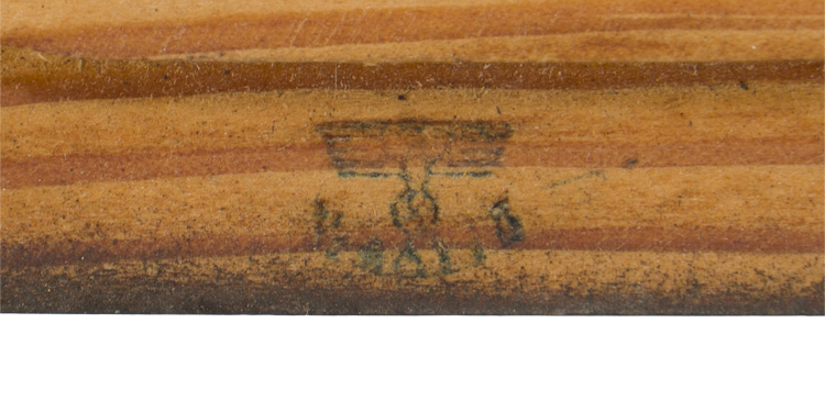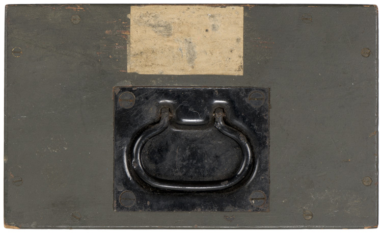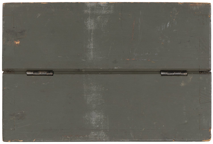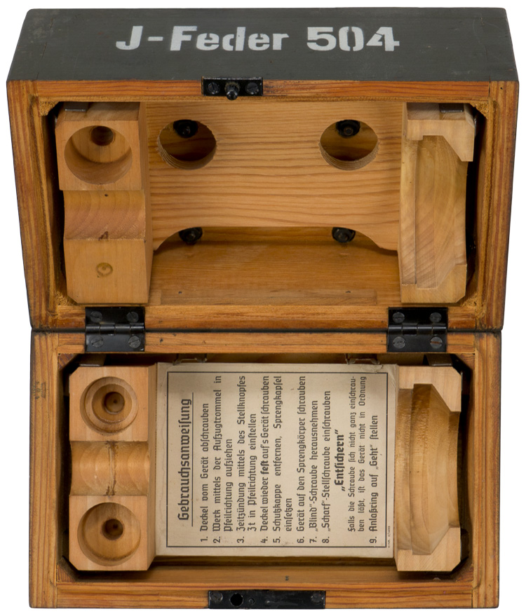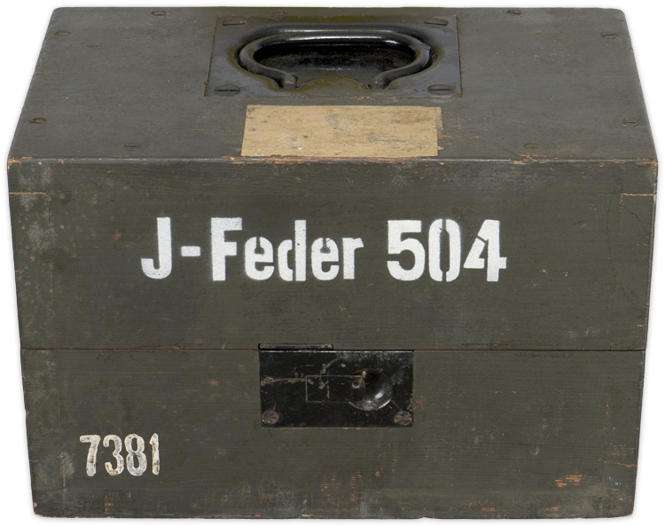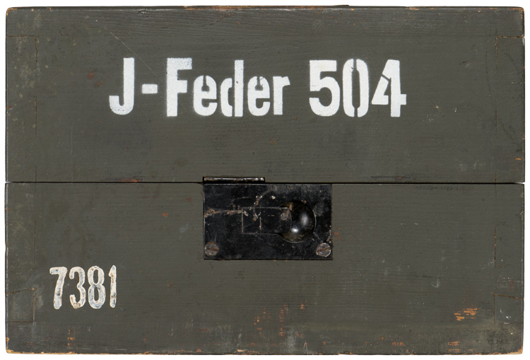 A 15cm x 16cm x 24.5cm, painted wooden transport/storage crate with dove tailed corner joints, hinged lid, spring latch and carrying handle. Stencilled in white paint to the front panel is “J-Feder 504" “7381". The interior of the case is in natural wood and has carved, wooden, frame panels and screwed on, sheet metal, component retaining clips. The carved wooden frame panels have two, small, circular, cut outs with one designed to secure the screw threaded, plunger/striker type device, while the other was designed to secure a dummy/safety device.. Both of which are not included. A “Instructions of Use” section of printed paper is glued to the bottom of the case.