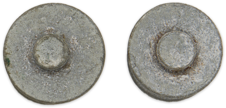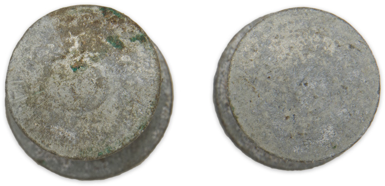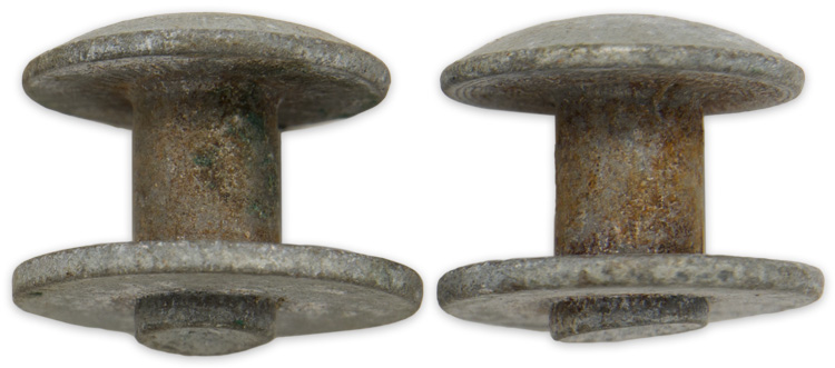 With the development of poisonous gasses used as offensive weapons in WWI appropriate defensive gasmasks also had to be developed. The German WWI M1915 and M1917 gasmasks evolved into the Reichswehr era M24 gasmask and eventually into the M30 and M38 gasmasks used in WWII. All German Army personnel were issued with a gasmask, carrying canister and accessories and were required to have it readily available at all times. Both the WWII M30 and the M38 gasmasks canisters came equipped with a shoulder carrying strap and a small belt support strap. Although the use of chemical warfare agents was considered by the German OKW, (High Command of the Armed Forces), fear of the Allies retribution forced them to reconsider and shelf the idea. Fear of the potential use of chemical warfare agents made the gasmask and canister a constant companion of the German soldier through-out the war.PHYSICAL DESCRIPTION: Set of two gasmask shoulder strap studs. Zinc construction.
