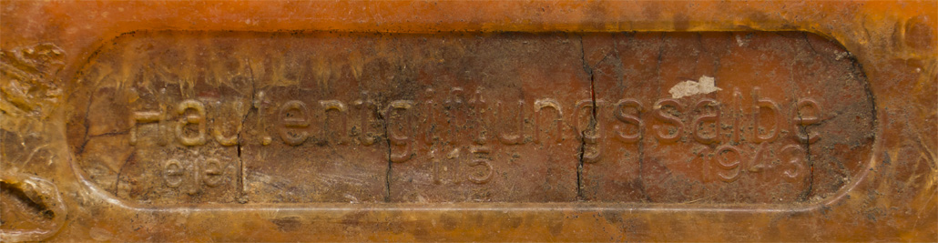 PHYSICAL DESCRIPTION: Roughly, 10cm tall, 6.5cm wide and 2cm thick, molded orange bakelite construction, flask like, container with an extended, 3cm tall, pointed tip spout with a screw cap closure to the top edge. The bottom edge of the container is well marked with embossed script, "Hautentgiftungsalbe", (Skin Decontamination Ointment), the manufacturers three letter code and date, "eje" "1943".