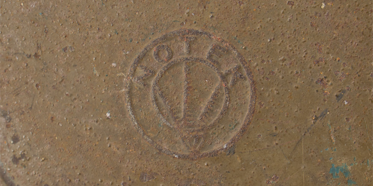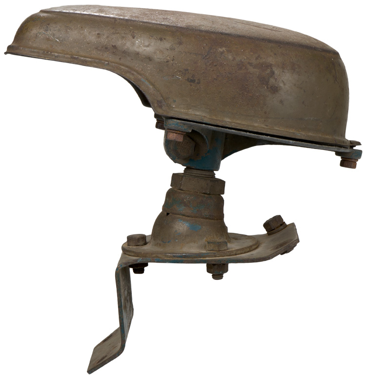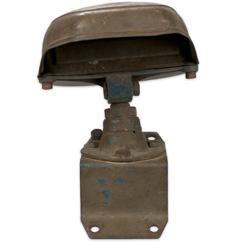 As a security precaution, laws were imposed that all vehicles, both military and civilian, were required to mask their headlights when night driving was permitted. This was accomplished by a wide variety of expedient measures on civilian vehicles and the more permanent measure of a factory manufactured black out light, on most military vehicles. Tooled sheet metal and steel construction, vehicular "Notek" black out light. Light consists of a slightly convexed top, oval shaped hood with a flat forward edge. The top front of the hood has an embossed manufactures logo and name, "Notek". Decent example.
