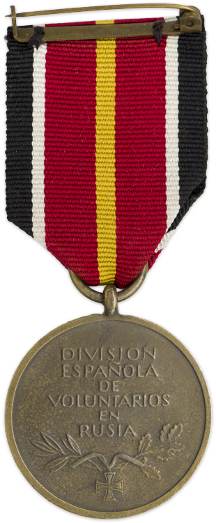 PHYSICAL DESCRIPTION: Die struck alloy, award with a gilted bronze wash. The obverse features a raised outer lip encircling an embossed German style helmet situated above two shields, with one shield having an embossed German Wehrmacht style eagle with down-swept wings and the other shield having the embossed Spanish Falangist emblem of a bundle of five upward pointing arrows. The shields are superimposed over an embossed, horizontal broad sword. The bottom of the obverse also has an embossed static swastika superimposed over a cluster of laurel leaves all on a smooth background field. The reverse also features a raised outer lip encompassing embossed Latin script, "Division Española de Voluntarios en Rusia", (Spanish Volunteer Division in Russia), situated above an embossed Iron Cross with oak-leaves to the right and laurel leaves to the left on a smooth background field. The ribbon suspension ring and loop are both intact and comes the original ribbed rayon ribbon which is in both the German and Spanish national colors of black, white, red and golden yellow. German production example. Nice!