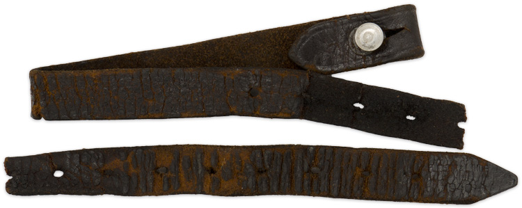 PHYSICAL DESCRIPTION: This section of the chinstrap is the longer of the two (strap portion). Strap is broken in two. Maker marked and dated for 1940. Original stud is included.