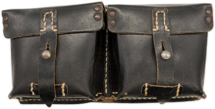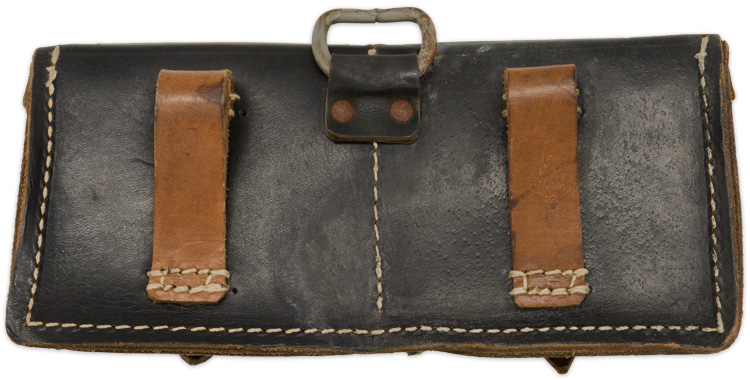 PHYSICAL DESCRIPTION: Blackened leather construction, two compartment GW/K43 ammo pouch with steel fittings. Each compartment has a fold over top lid with rivetted seams and a vertical, leather closure strap with a single stud eyelet machine stitched to the obverse. The closure straps attach to corresponding, machine stitched, leather reinforced, steel studs positioned on the front body of each compartment. The front of each compartment also has a machine stitched on, horizontal leather retaining loop. The reverse of the pouch has two machine stitched on, vertical, leather belt loops and a central, rivetted on, leather reinforced steel "D" ring. Dated for 1944. The pouch is in overall very good condition and the leather is still quite supple.