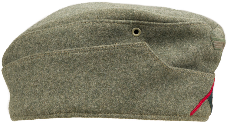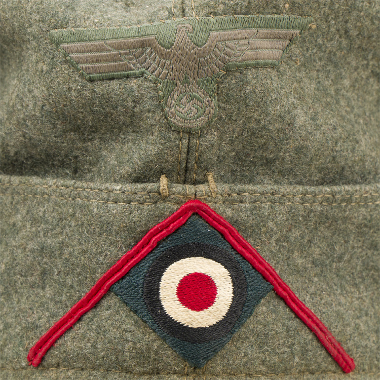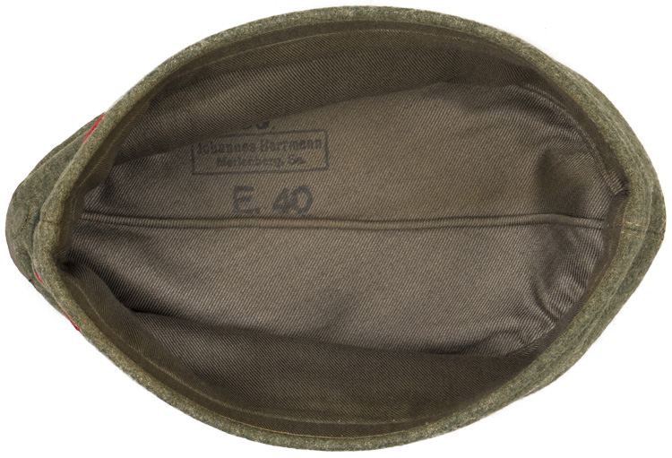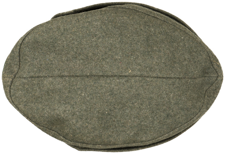 PHYSICAL DESCRIPTION: Field-grey, wool/rayon blend construction cap with fold down side and back panels with gently sloping, downward scallops to the front and forward sides. As is typical the fold down panels are handstitched in the upright position at the front center of the cap. The cap has a field-grey enamel painted, metal alloy, ventilation grommet to either side, positioned just below the crown edge. The front center of the cap has a machine woven, national eagle in pale, mouse grey, threads on a cut-out, woven, field-grey rayon base. The eagle is neatly handstitched to the cap. The front center of the fold down panels has a machine woven, national tri-color cockade, on a woven, diamond shaped, blue/green rayon base. The cockade is machine stitched to the cap. The cap has a bright red rayon, inverted, "V", soutache flanking the cockade indicating service with the Artillery. The soutache has been applied in the correct manner, being machine stitched in place and inserted through two, small, puncture holes near the bottom edge of the cap. The interior of the cap is fully lined in ribbed, grey cotton/rayon blend material. Superb, size, maker and depot markings. One of the nicest we have had!