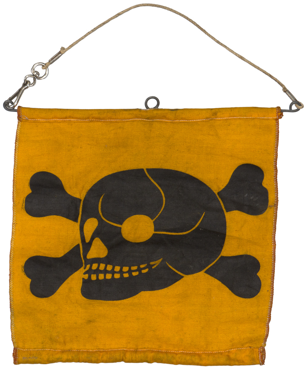 PHYSICAL DESCRIPTION: Roughly, 18cm square, woven yellow/orange rayon construction, dual sided, flag with a central black printed skull and cross bones. The skull and crossbones are more detailed than those found on the small triangular pennants, and is similar to the SS style Totenkopf emblem. The side edges of the flag have dual ply, hemmed, reinforcement seams. All complete.