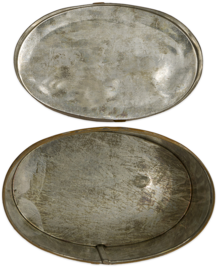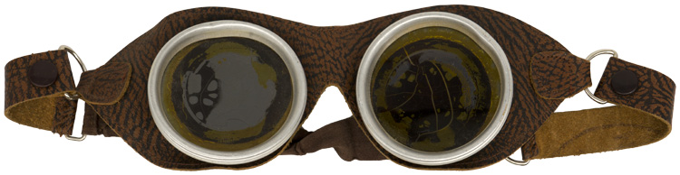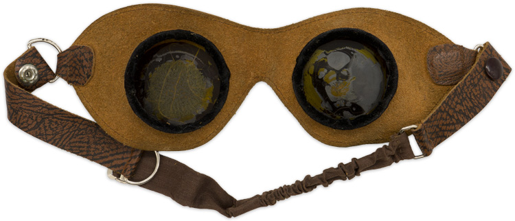 PHYSICAL DESCRIPTION: General purpose goggles with a cut-out, leather frame with stitched on, circular metal alloy lens retainers. Each amber lense has five ventilation holes to the bottom. Comes with original case and a small leather pouch with additional lenses. The container has some denting and is a bit misshapen which causes the top to go on with a bit of difficulty.