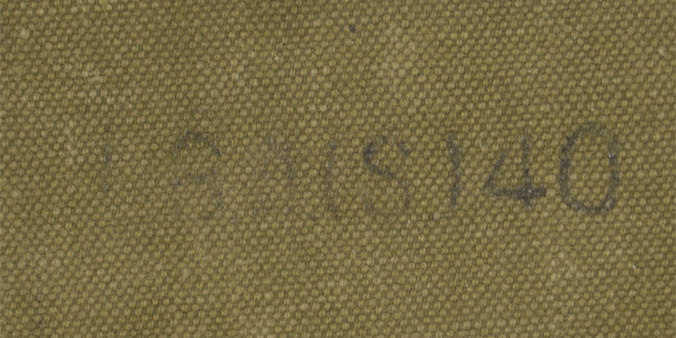 PHYSICAL DESCRIPTION: Olive drab, water repellent, canvas construction bread bag with leather, steel and alloy fittings. All buttons are present and the straps are complete. Shows the expected period use and wear.