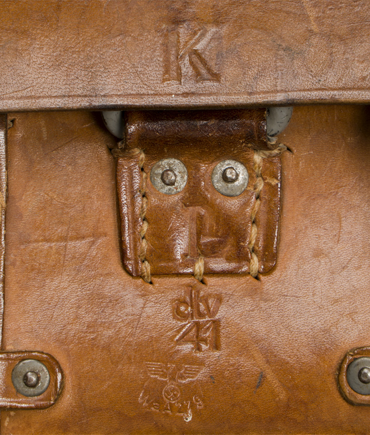 PHYSICAL DESCRIPTION: Thick, molded, light tan leather construction medical pouch for unmounted personnel with a slightly curved reverse, machine stitched seams and steel fittings. The top of the pouch has a fold back lid with a machine stitched, horizontal, leather hinge to the obverse and a vertical leather closure strap, with a single cut-out eyelet, to each side which attached to extended steel studs positioned on each side of the pouch’s body. The reverse of the pouch has two, stitched on, vertical, leather belt loops with stitched on, horizontal, retaining loops. The belt loops also have a single cut-out eyelet and attached to steel studs positioned on the bottom edge of the pouch’s body. The reverse of the pouch also has a central, stitched, leather retainer securing a steel "D" ring. The reverse of the pouch is well marked with "K", indicating, Kragenträger, (Stretcher bearer), and a waffen-amt. Maker marked and dated for 1941.