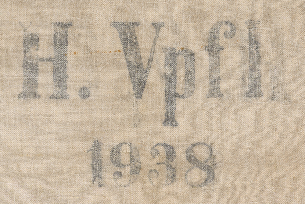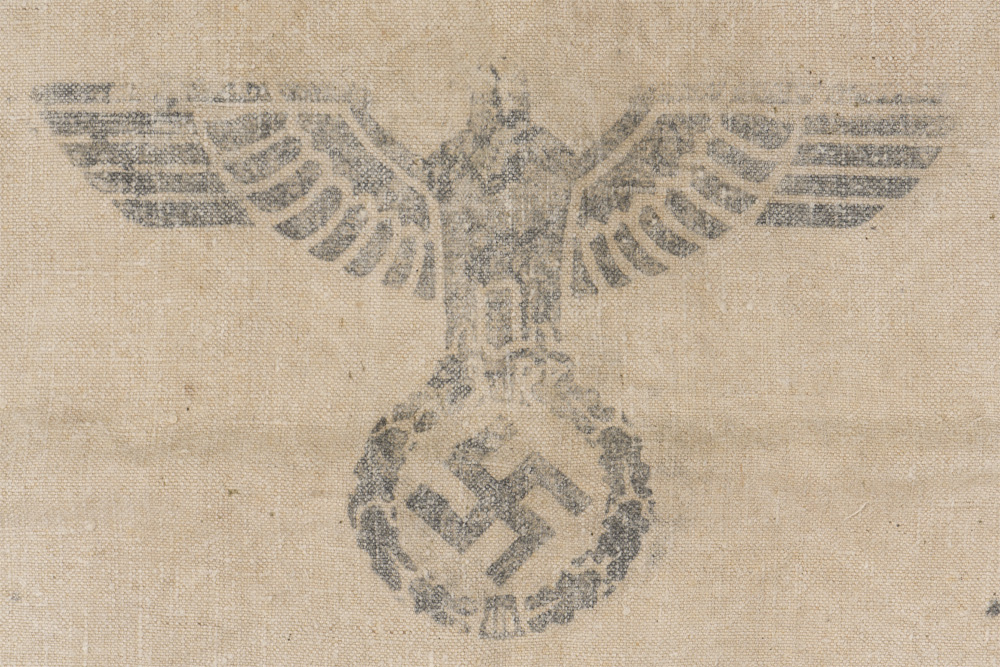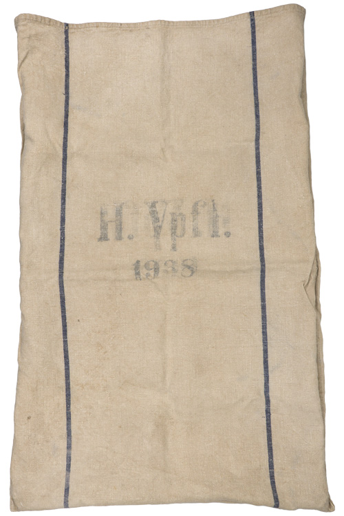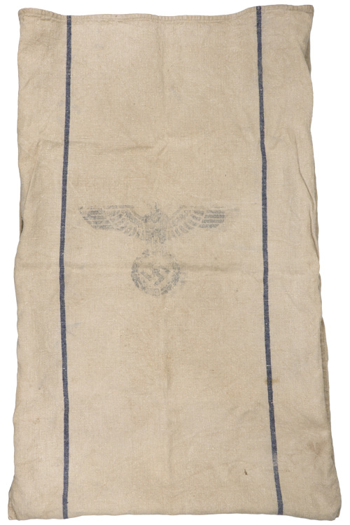 PHYSICAL DESCRIPTION: Heavy, woven, white canvas construction provisions/supply bag portion that features a large black printed, national eagle with outstretched wings, clutching a wreathed, canted swastika in it’s talons to one side, while the opposite side reads "H.Verpfl. 1938" (Heeres Verpflegung or Army Supply Service). The supply bag measures approximately 68cm x 102cm. Shows the expected period use and wear but overall nice condition.