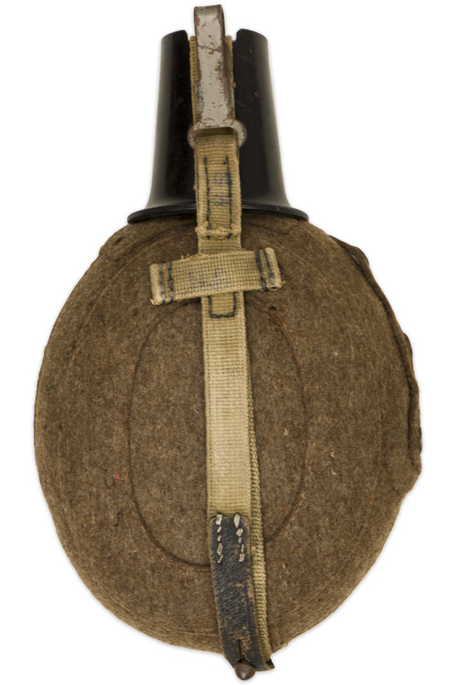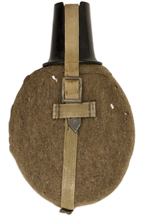 BACKGROUND: Introduced in 1931 the standard issue M31 canteen was based on the WWI M1893 and M1907 canteens with minor modifications. Originally the M31 canteens were manufactured in aluminum but later as the aluminum was required for other more critically essential items the canteens began to be manufactured in steel. In late 1940 with the impending German entrance into the North African campaign the standard brown felt cover and leather retaining straps and carrying harness of the M31 canteen were altered to an olive drab felt cover and web straps for longer wear in the tropical climate. Another variant, developed in late 1941, was the replacement of the felt covers with a plastic impregnated wood covering for better durability. When issued the canteens came with an integral carrying straps and harness and regulations prescribed the assorted manners in which the canteen was to be carried with the most common form being to secure it to the bread bag suspended from the load carrying waist belt although other methods were also utilized. With potable fluids being such an essential item for an individuals well-being the canteen must be considered as a very important piece of personal kit. Of Note: The M31 canteens with tropical olive drab felt cover and web strap configuration were eventually issued to personnel on the continent as leather stocks were depleted during the war.