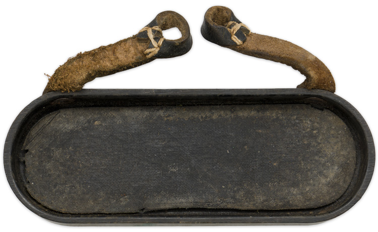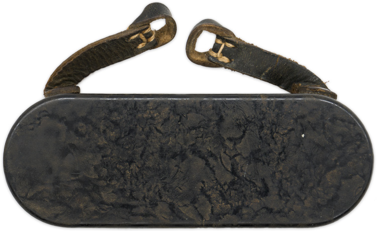 PHYSICAL DESCRIPTION: Elongated, horizontally oval, bakelite construction protective lens cover. Original strap loops are still present.