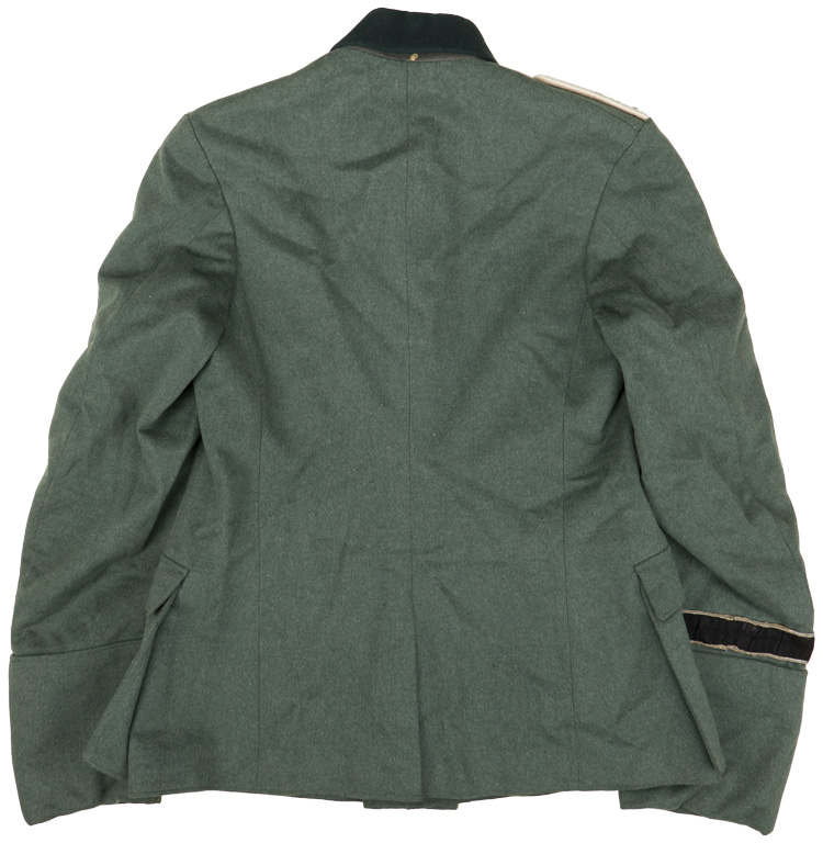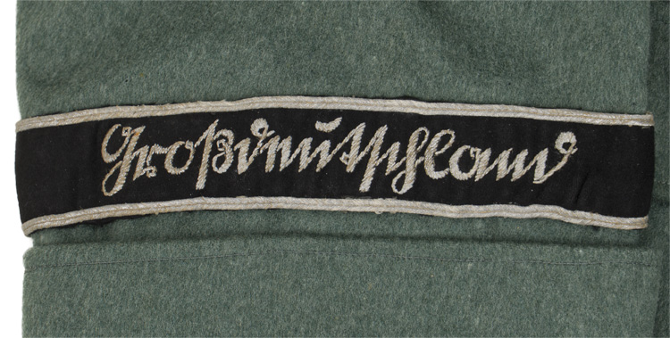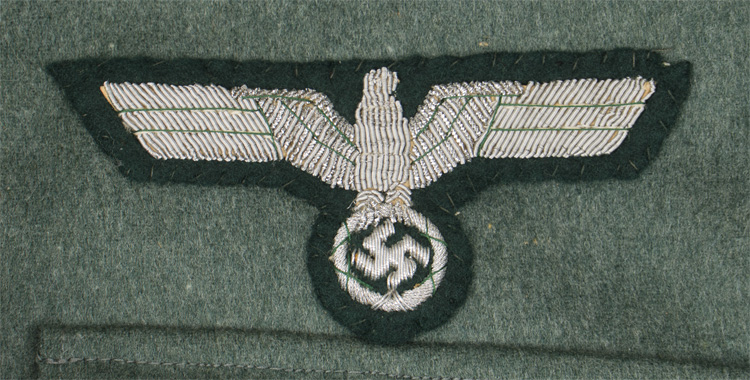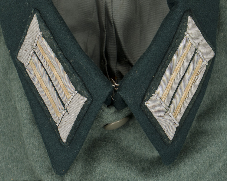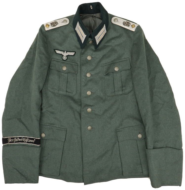 PHYSICAL DESCRIPTION: Nice quality, private purchase, field-grey wool/rayon blend construction tunic. The tunic features a vertical, six button front closure with dual metal hooks and eyes at the neck. The tunic has four, pleated, front pockets with scalloped button down flaps. The right breast has a hand embroidered breast eagle in bright silver/aluminum wire and bullion threads with green accent threads, on a cut-out, dark blue/green badge cloth base. The eagle is neatly handstitched to tunic. The straight cut, non-adjustable sleeves have deep, turned up French cuffs which are tacked into the upright position. The reverse of the tunic has a central, vertical tail skirt vent. Nice quality, black, doeskin, wool construction cufftitle features hand embroidered Sütterlin style script, "Großdeutschland", in bright, silver/aluminum wire threads. The cufftitle is bordered at both the top and bottom edges in horizontal, bright, silver/aluminum Russian braid. The tunic has sewn on shoulder boards of matte silver/aluminum Russian braid with a single stamped, gilt washed, alloy rank pip and "GD" cyphers to each. The tunic has a lay down, blue/green badge cloth collar with the typical zig-zag reinforcement stitching to the reverse. The collar features hand embroidered collar tabs in matte silver/aluminum wire threads with twisted white rayon branch of service stripes. The collar tabs are mounted on blue/green badge cloth bases which show through as the center stripe. The collar tabs are neatly handstitched to the collar. The interior of the tunic is fully lined in grey/green rayon with off-white striped sleeves. The buttons are all the field-grey painted, pebbled, magnetic sheet metal type and appear to have their original stitching. Shows the expected period use and wear but overall nice condition. Few tiny moth nips and nap wear. The tunic is roughly a size 32" to 34" chest. All original insignia, but it has been collector added to the tunic to the tunic.