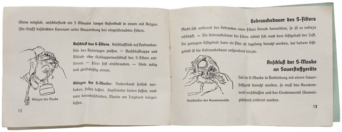 BACKGROUND: The German army went to great lengths to ensure its personnel were provided with the best in depth training that was available at the time. The training took many forms and in an attempt to replicate the most realistic combat conditions possible the German army used live fire training exercises and found a one percent training fatality rate as acceptable, reasoning it was better to remove inadequate personnel in training as opposed to having them risk other lives in actual battle. Besides the live field training and exercises the Germans also utilized numerous official training manuals and booklets for all of the specific branches of service within the army. The official army training manuals were authorized and distributed by the H.Dv., Heeresdruckvorschriftenverwaltung, (Army Regulations Administration), under the control of the OKH, Oberkommando des Heeres, (High Command of the Army), and the OKW, Oberkommando des Wehrmacht, (High Command of the Armed Forces). Of Note: Besides the official training manuals there were also numerous semi official and unofficial training booklets with the most famous being the Reibert series of training booklets. These semi official and unofficial training booklets generally gained the approval of the High Command and were encouraged to stimulate interest in joining the Armed Forces. With the development of poisonous gasses used as offensive weapons in WWI appropriate defensive gasmasks also had to be developed. The German WWI M1915 and M1917 gasmasks evolved into the Reichswehr era M24 gasmask and eventually into the M30 and M38 gasmasks used in WWII. All German Army personnel were issued with a gasmask, carrying canister and accessories and were required to have it readily available at all times. Although the use of chemical warfare agents was considered by the German OKW, fear of the Allies retribution forced them to reconsider and shelf the idea. Fear of the potential use of chemical warfare agents made the gasmask and canister a constant companion of the German soldier through out the war. As with any equipment the appropriate training was provided by the army’s, H.Dv.,and included assorted training manuals.