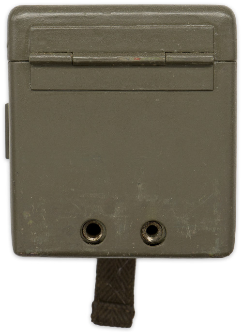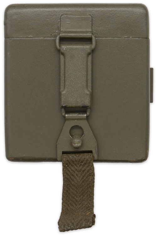 PHYSICAL DESCRIPTION: A feldgrau painted (possibly over painted), sheet metal construction MG light battery box. The box features a fold back top lid with a staggered, bar, hinge to the reverse and a spring loaded, closure clip to the obverse. The closure clip attaches to a extended steel stud positioned on the lower front of the box’s body. The lower reverse of the box has dual plug outlets for the electrical cable to attach it to the MG. One side of the case has a brazed on, extended, slotted, sheet metal panel designed to secure the box to the MG’s tripod. The interior body of the case has a molded black bakelite frame and riveted on brass panels. Felt pad is missing from the inside top lid.