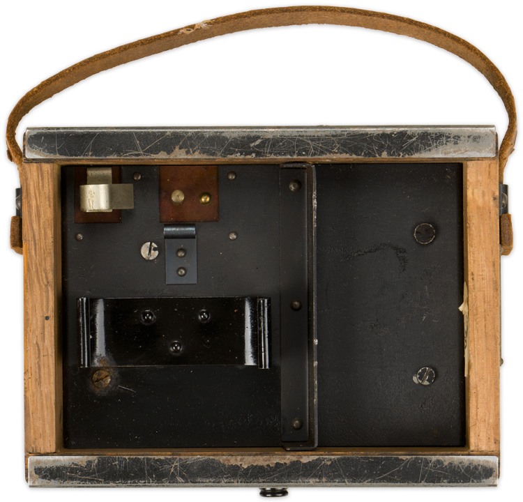 A wooden7.5cm x 11cm x 15cm wooden box with hinged lid and leather carrying handle that holds a voltage metre. The magnetic metal bottom slides out to reveal the underside of the metre. A brass plate with the manufacture name "Schoeller & Co. Frankfurt A/M.S." is visible when the bottom is moved.