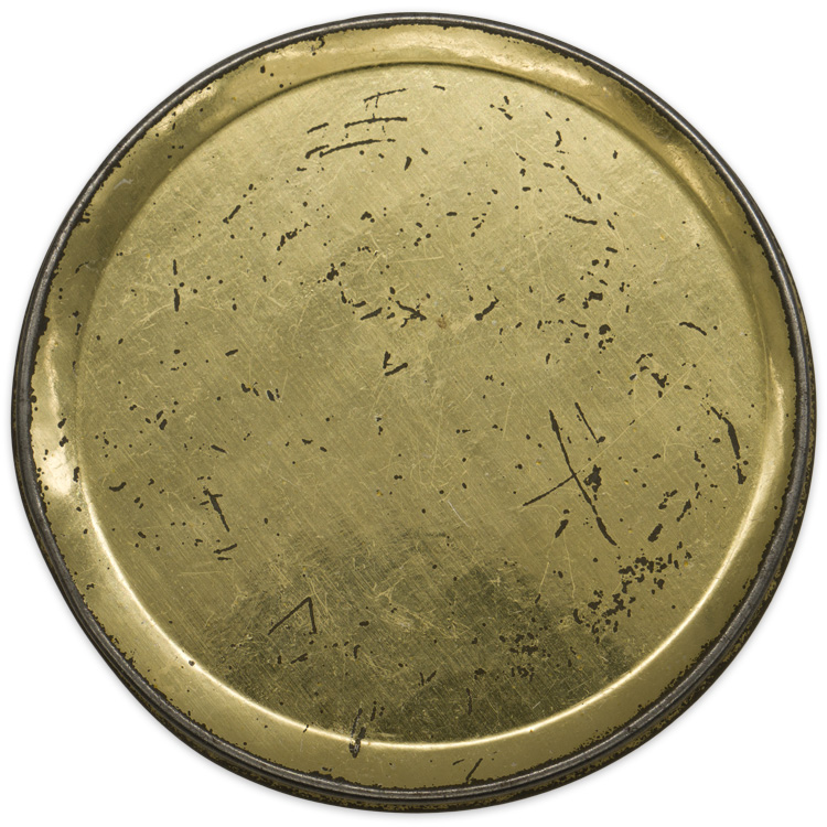 An 8cm x 2cm tall, magnetic sheet metal container with painted design with friction top lid.
