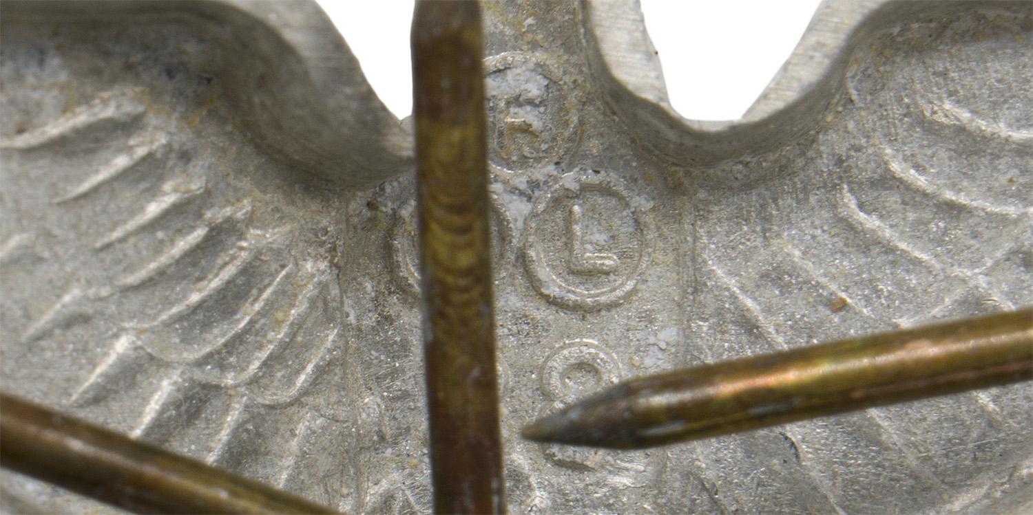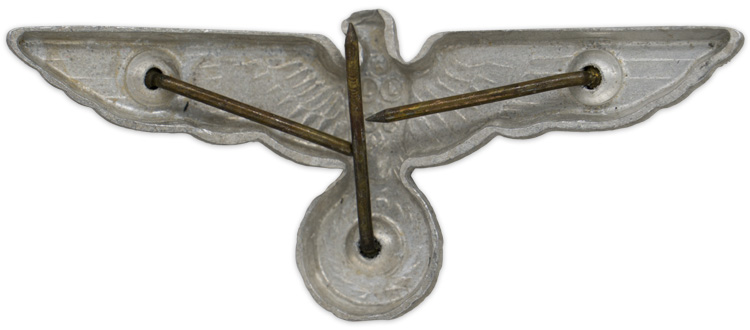 PHYSICAL DESCRIPTION: Second pattern, (Circa March 1935 May 1945), aluminum construction national eagle features outstretched wings, and is clutching a wreathed, canted swastika in it’s talons. Original prongs are intact.