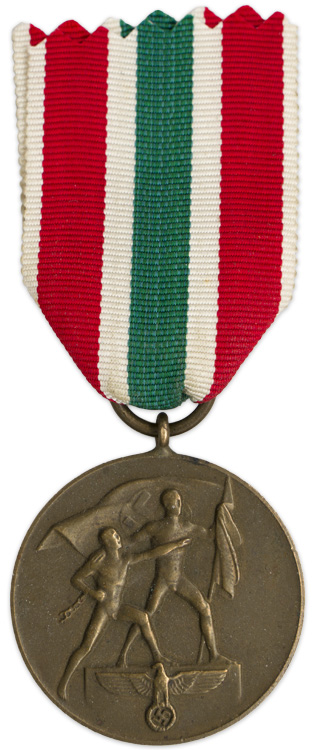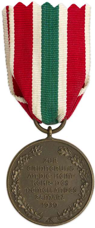 PHYSICAL DESCRIPTION: Bronze washed, die struck ,alloy construction medal. The obverse of the medal features two, embossed, figures symbolically breaking the chains of bondage with an unfurled, national flag in the background and a high relief, national eagle to the bottom. The reverse features embossed Latin script to the center, "Zur Erinnerung an die Heim kehr des Memellandes 22. März 1939", (To commemorate the return of the Memel District 22 March 1939), encompassed by an embossed oak leaf wreath. The medal loop and ribbon suspension ring are both intact. The medal has no visible manufacturer’s markings. Comes with a section of original ribbon.