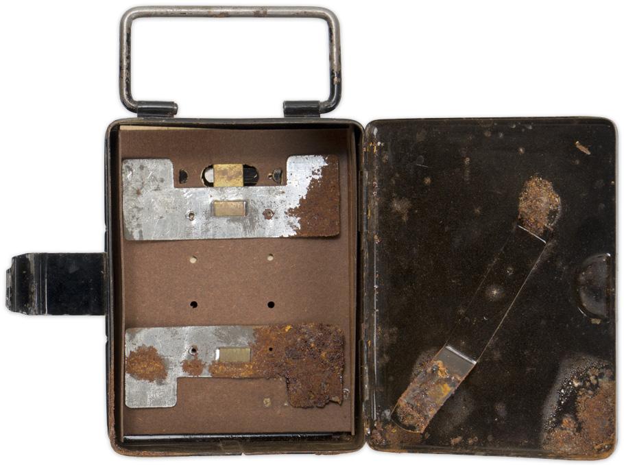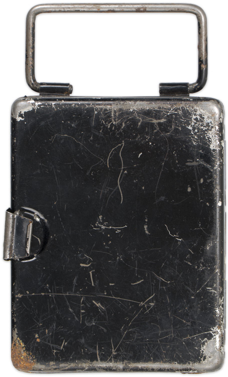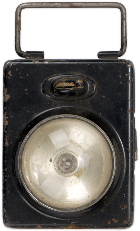 A 4.5cm x 9cm x 12cm, black painted, metal alloy flashlight with wire handle and bulb. The hinge works smoothly revealing an empty cavity for the batteries. The flashlight is unmarked. The surface shows typical wear with some rusting.