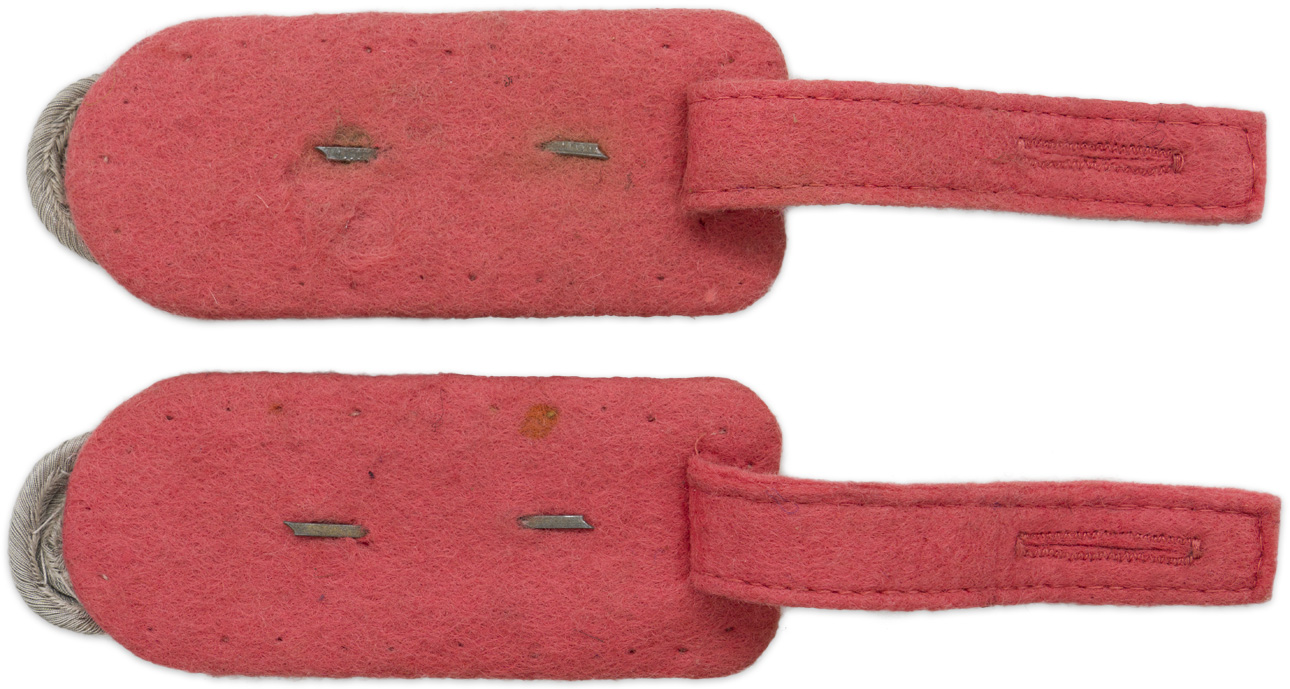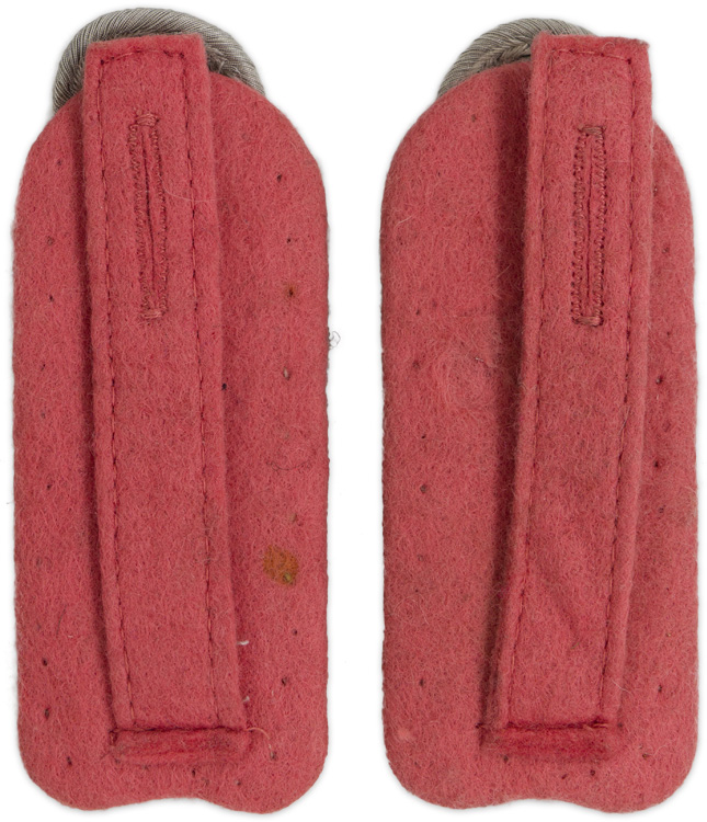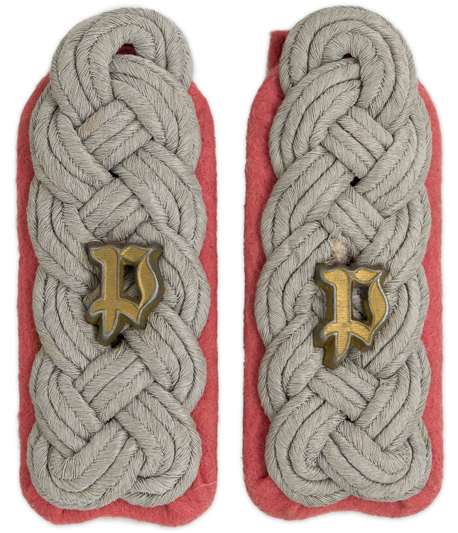 PHYSICAL DESCRIPTION: Slip on shoulder boards of interwoven, matte, silver/aluminum Russian braid with gilt washed, stamped alloy, 1935 Wehrmacht pattern, Gothic "P" cypher all mounted on a pink wool waffenfarbe base. Of Note: The Gothic "P" cypher indicated, Panzerjäger, which literally translated means "Armor hunter", but figuratively indicated "Anti tank" personnel. Nice set!