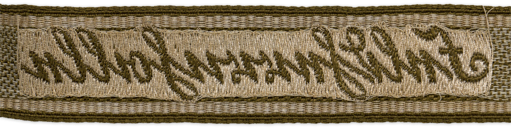 PHYSICAL DESCRIPTION: Roughly, 30mm tall, 48cm long, machine woven, tan rayon construction cufftitle with a repeating, interwoven, waffle pattern and machine, "BeVo", woven, Sütterlin style script "Feldherrnhalle" in silvery/grey celleon threads. The cufftitle is bordered at both the top and bottom edges in six strand, horizontally woven, silvery/grey celleon threads. Small snag to the material about 9cm away from the right end (see photo).The reverse of the cufftitle has loosely woven, vertical, silvery/grey celleon threads around the script and the script is in a tan rayon mirror image of the obverse.