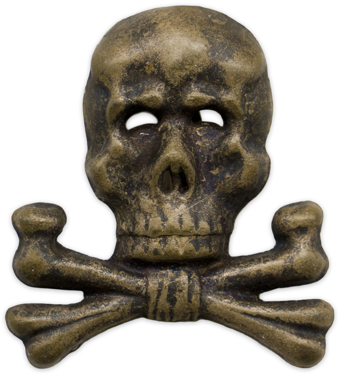 PHYSICAL DESCRIPTION: Roughly 30mm tall, 28mm wide, silver washed, die stamped alloy construction Officers pattern, Brunswick style skull and crossbones features a "face on", skull with two rows of teeth with the jaw bone resting on two, diagonally angled, crossed femur bones. The skull features embossed and recessed detailing, dual, horizontally oval, eye cut outs and dual, vertically oval nose cut outs. The reverse of the insignia is a mirror image of the obverse and has both of the original, soldered, attachment prongs is still intact. The insignia has no visible manufacturer’s markings. Scarce traditions cap badge.
