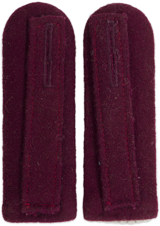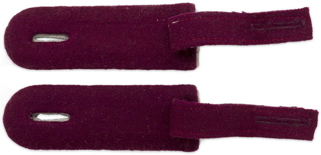 PHYSICAL DESCRIPTION: Slip on shoulder boards of matt silver/aluminum, Russian braid mounted on wine red wool waffenfarbe base. Nice clean matched pair.