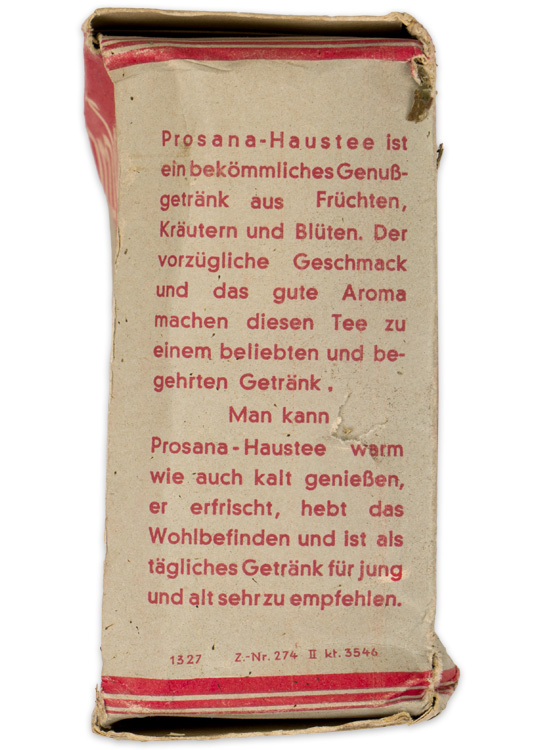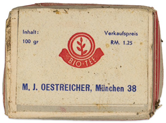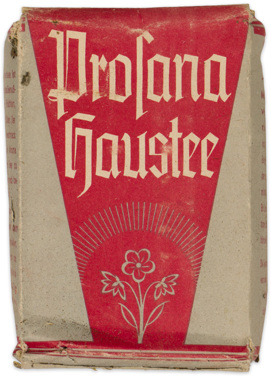 PHYSICAL DESCRIPTION: An approximately 12.5cm x 8.5cm x 6.5cm, unopened package of tea. The package is labeled, "Profana Haustee" and makers marked, "M.J. Oestreicher, München 38."