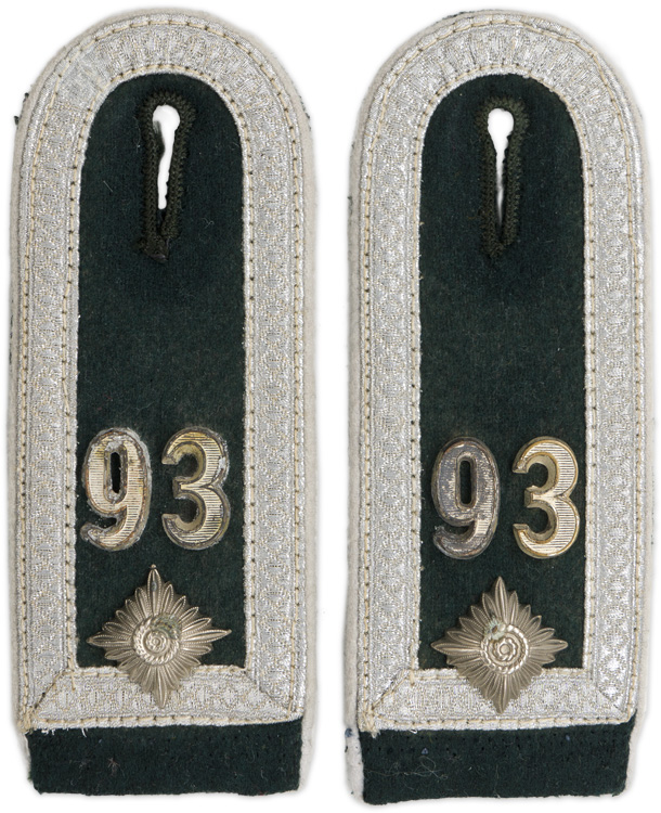 PHYSICAL DESCRIPTION: Early, (November 1938 May 1940), second pattern, blue/green badge cloth construction, sew on shoulder straps with a single rank pip to each along with bright silver/aluminum, diamond patterned, NCO’s tress to all the outside edges and white wool waffenfarbe piping. For the 93rd Infantry Regiment,