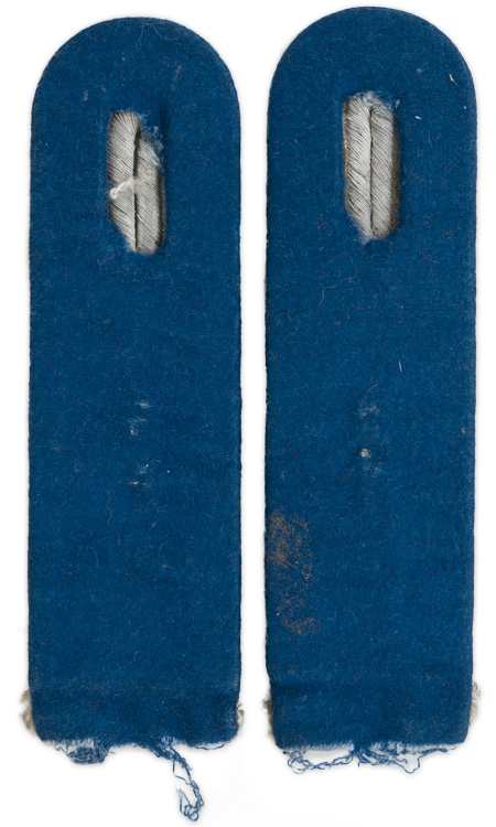 PHYSICAL DESCRIPTION: Sew on shoulder boards of matt silver/aluminum braid with mid blue velvet waffenfarbe. Each board has a Mercurial staff cypher. (Winged staff with dual intertwined serpents).