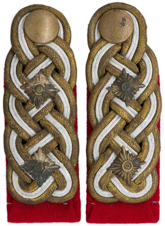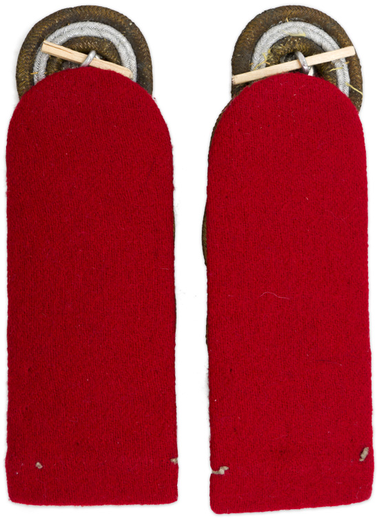 PHYSICAL DESCRIPTION: Sew on shoulder boards consists of three interwoven strands of Russian braid with a central silver/aluminum braid flanked by dual gilt bullion braids mounted a red wool waffenfarbe base. Double rank pips to each. Shoulder board represents the rank of General. Nice original pair.