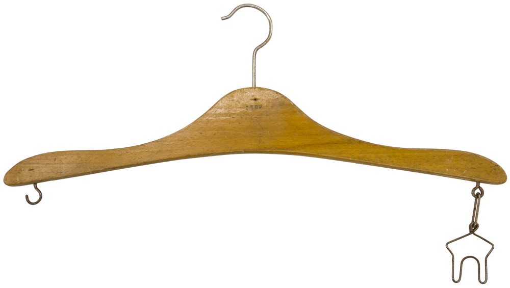 (Kleiderbügel)Original wood and metal coat hanger. Nicely marked "Eigentum der Uniformmützenfabrik Carl Halfar Berlin". Approximately 46cm x 18cm.