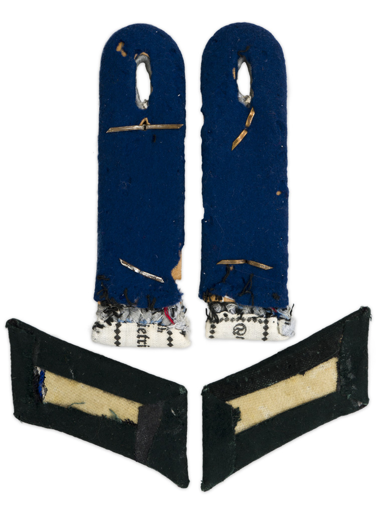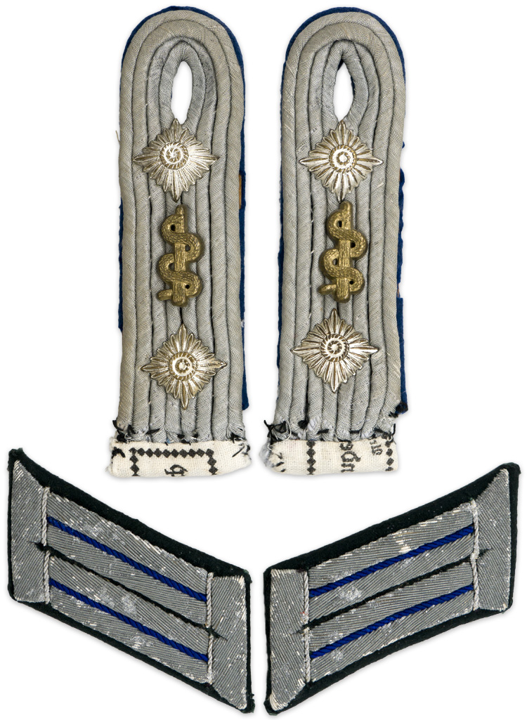 PHYSICAL DESCRIPTION: Nice set of uniform removed sew on shoulder boards with officers collar tabs. Very cool to see period name tags sewn on as extenders to the boards! The medical rank of Stabarzt is the equivalent to the standard rank of Hauptmann.