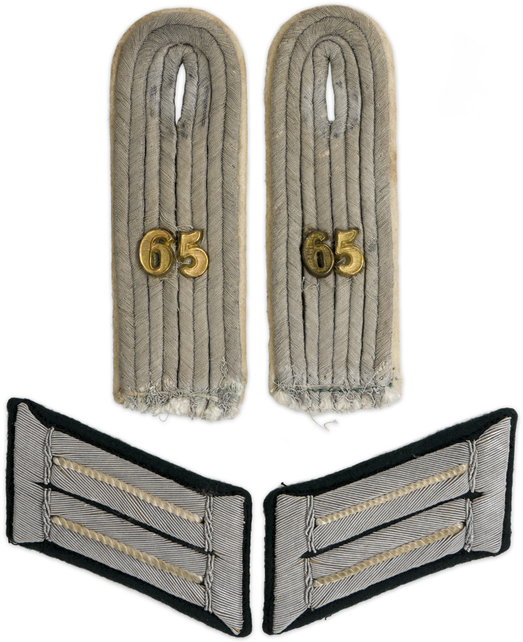 PHYSICAL DESCRIPTION: Nice set of uniform removed sew on shoulder boards with officers collar tabs. 65th Inf Rgt.