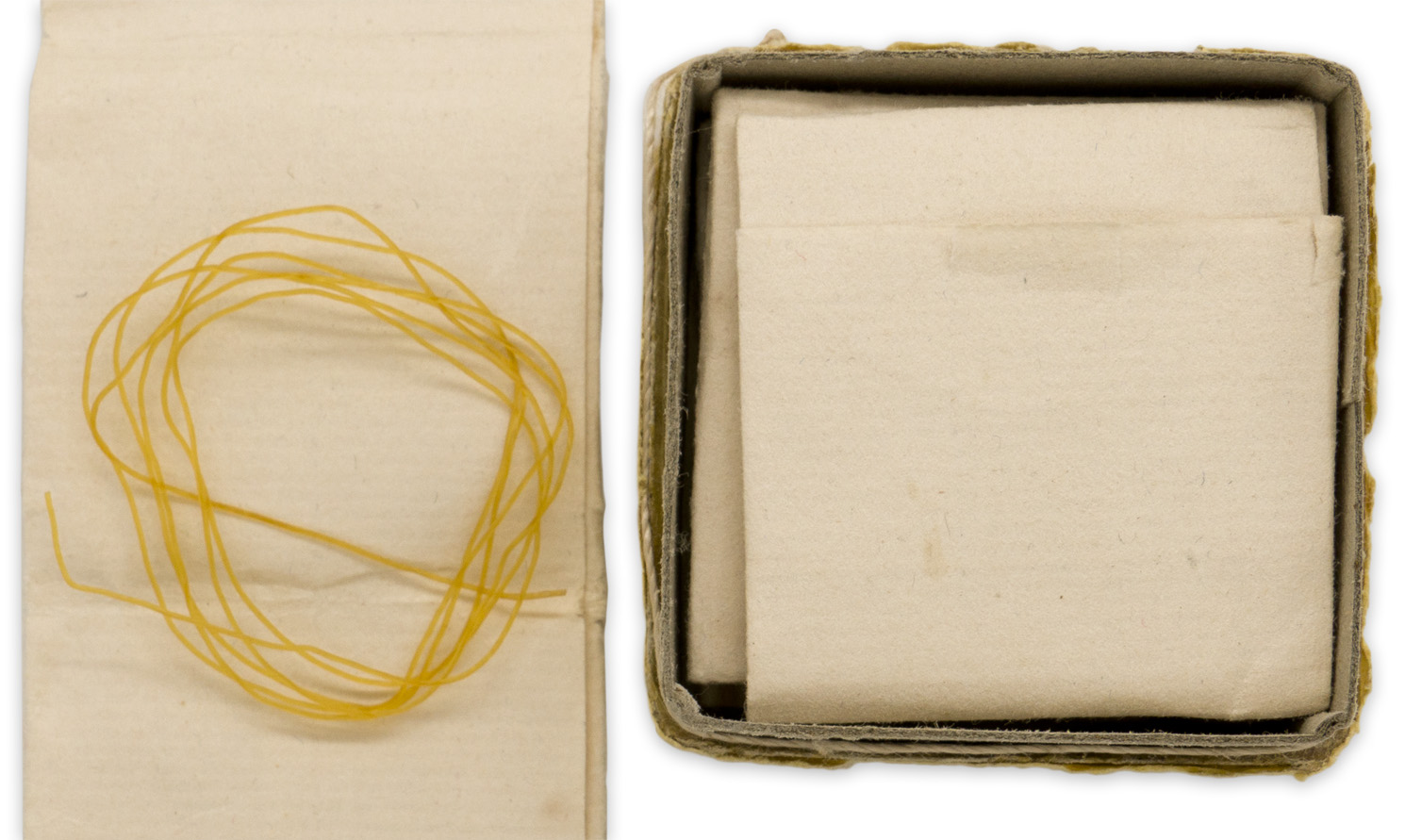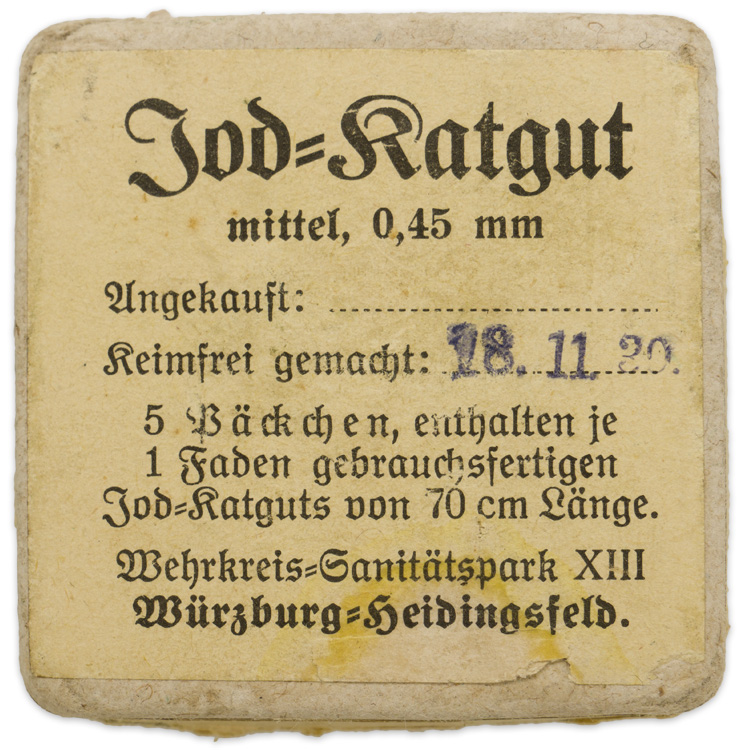 A small, two piece cardboard container with paper label that indicates it contains a fine, 0.45mm catgut that was sanitized on "28.11.30". Five pieces of catgut are included that are wrapped in paper. Also printed to the label is "Wehrkreis Sanitätspark XIII". The container measures approximately 6cm square x 2cm. Nice medical item.