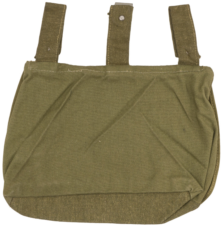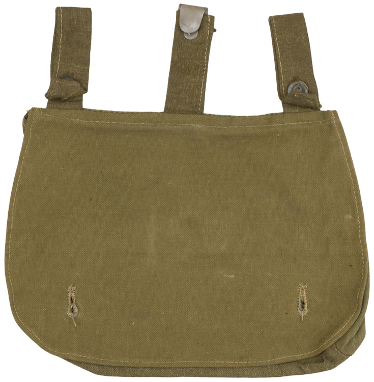 PHYSICAL DESCRIPTION: Olive drab, water repellent, canvas construction bread bag with leather, steel and alloy fittings. All buttons are present and the straps are complete. Typical late war example in nice clean condition.