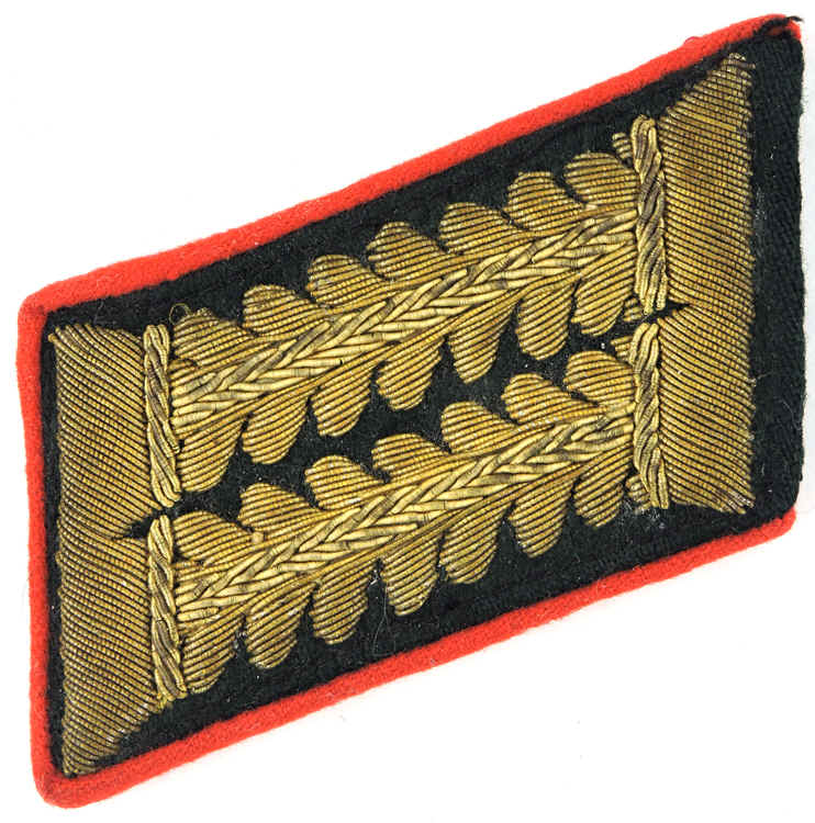 BACKGROUND: The use of collar ornamentation on military uniforms was utilized by numerous assorted nations with the main function being the indication of the wearers rank and/or branch of service. The German army had a tradition, dating from the 1700's, of maintaining a separate branch of Administrative Official’s attached to the army to oversee all administrative functions, thus freeing up active army Officer’s and allowing them to concentrate on actual military matters. The Official’s were responsible for a wide variety of administrative tasks from Court Martial, Librarian, Supply, Technical and Meteorological Services, to School, Barracks, and Hospital administration. Most officials careers consisted of four varying grades, of high, elevated, medium and low grade with slightly differing identifying insignia for each grade. The grade of the career was determined by the education and/or experience of the individual. Regulations of March 12TH 1937 reorganized the Officials and instituted the new Beamte auf Kriegsdauer a.K., (Wartime Official’s for the duration of the war), to be activated in times of mobilization. Originally the uniformed Official’s were allotted an identifying dark green branch of service color, (waffenfarbe), with a nebenfarbe, (secondary color), to indicate their actual career. Regulations of March 21ST 1940, replaced the assorted nebenfarbe colors with a secondary color of light grey for all Officials regardless of career or function. In January 1944 the Army instituted a new career for officers and certain officials, entitled, TSD, "Truppensonderdienst", (Special Service). This new career used light blue waffenfarbe and did away with secondary colors as worn by Officials in the other careers. On May 1ST 1944 all high grade career Administrative officials were transferred to the TSD.