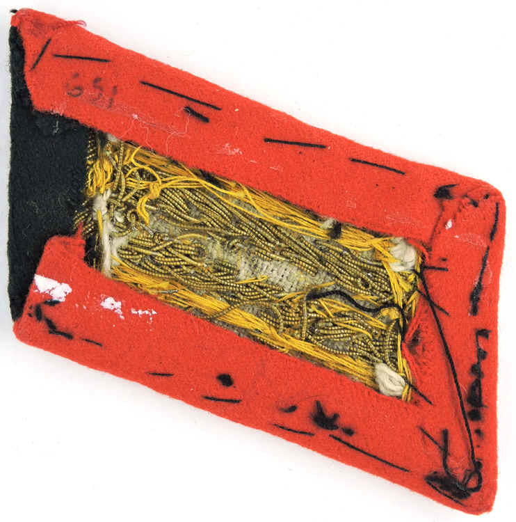 PHYSICAL DESCRIPTION: Pre-March 1940 pattern, elongated, rectangular, blue/green badge cloth construction collar tab with the distinctive Official’s old Prussian style, dual, embroidered serrated litzen with seven teeth to each side, in gilt wire threads with the correct, regulation "V" pattern, gilt bullion wire "branch of service" stripes. All but the forward edge of the collar tab is piped in red wool nebenfarbe.