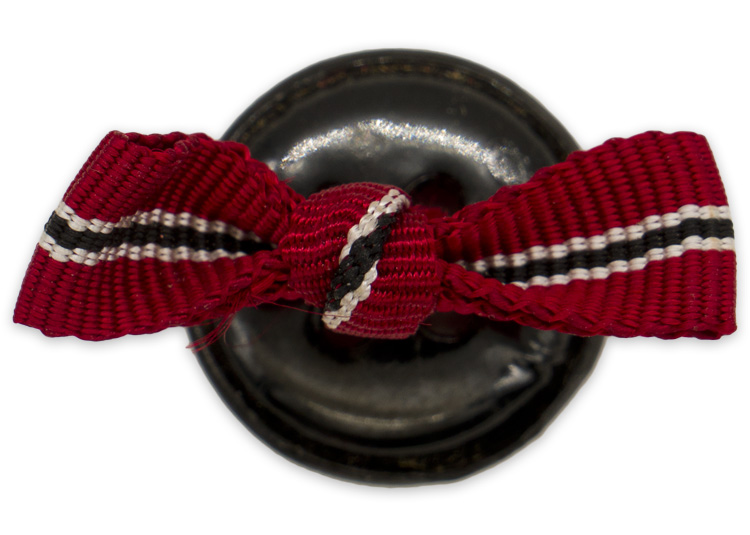 PHYSICAL DESCRIPTION: A miniature ribbon tied in a bow that is hand stitched to the original button.
