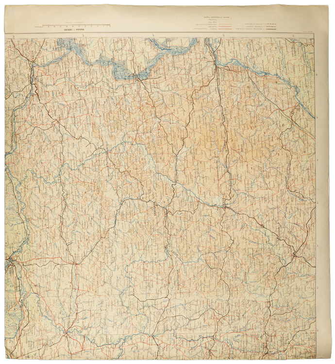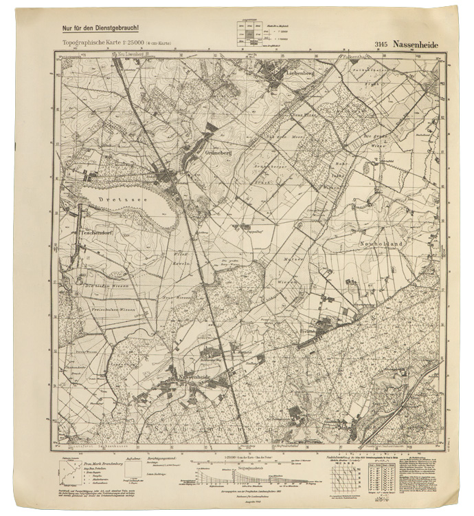 A 52.5cm x 58cm, printed, black and white, 1:25,000 scale army issue map of the Nassenheide region of Germany situated just south west of Berlin. The top edge of the map has printed script which includes, "Nur für den Dienstgebrauch!" (For service use only!). The map shows all of the topographical features of the region as well as cities, towns and villages, and the road and railway networks. The bottom edge of the map has printed script which includes, "Herausgegeben von der Preußischen Landesaufnahme 1883, Reichsamt für Landesaufnahme, Ausgabe 1942", (Published by the Prussian Land Survey Office 1883, National Land Survey Office Published 1942). The map also has an additional printed date, "2. 1945". The map shows light age yellowing and has been stored rolled up so there are no fold creases. Interestingly the reverse of the map has an additional full color printed map of the "Ssaransk-Pensa", region of central Russia. The map also shows all of the topographical features of the region as well as cities, towns and villages, and the road and railway networks. The right side and the top edge of the Ssaransk-Pensa map have been cut-off but it does not affect the Nassenheide map on the other side.