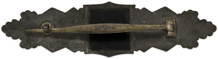 PHYSICAL DESCRIPTION: Nicely detailed, die struck, zinc alloy construction clasp with a silver washed finish. The clasp features a central square panel with a recessed background field with an embossed national eagle with out-stretched wings, positioned above a crossed bayonet and grenade, flanked by four oak-leaves and dual acorns superimpose on a ribbed, horizontal outward, pointing base. The clasp only retains a portion of its original silver washed finish. Backing plate is complete. The reverse has a soldered, block type hinge, a broad, tapering, horizontal pin and a soldered catch on an oval base plate. The clasp has no visible manufacturers markings.