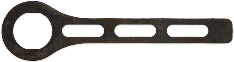 PHYSICAL DESCRIPTION: Blued, cast steel construction assembly tool is roughly 9" long with a cut-out, 2 3/8" diameter circular head and three oval cut-out slots in the handle. The tool has an all over, repeating embossed, hatch pattern for better grip. The tool has a faint, impressed, manufacturers code that appears to be, "clc" indicating manufacture by Richard Herder Solingen.