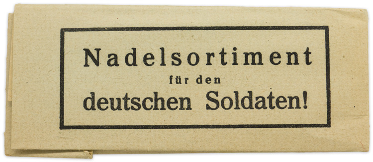 Although each Company in the German army would be assigned a tailor and a cobbler the individual soldier was still expected to care for and do basic maintenance on his issue uniform garments. As a result most soldiers were equipped with a basic "housewife" kit which would contain sewing supplies including needles. Light weight, folded paper envelope with black printed Latin script to the obverse. Original needles included.