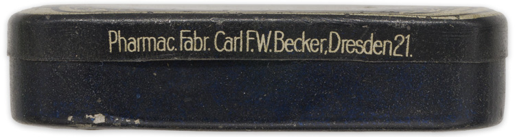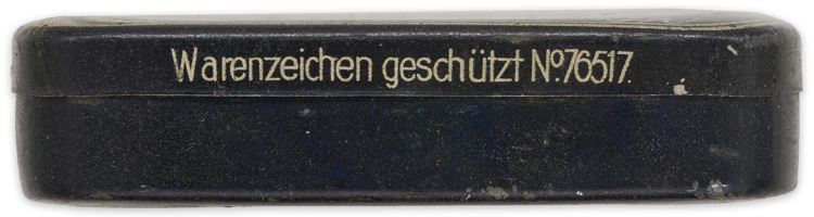 A two piece, magnetic, sheet metal alloy constructed tin that measures approximately 7cm x 3.5cm x 2cm. It contained Lebewohl brand bandage plasters for the medical kit. Used to treat blisters.