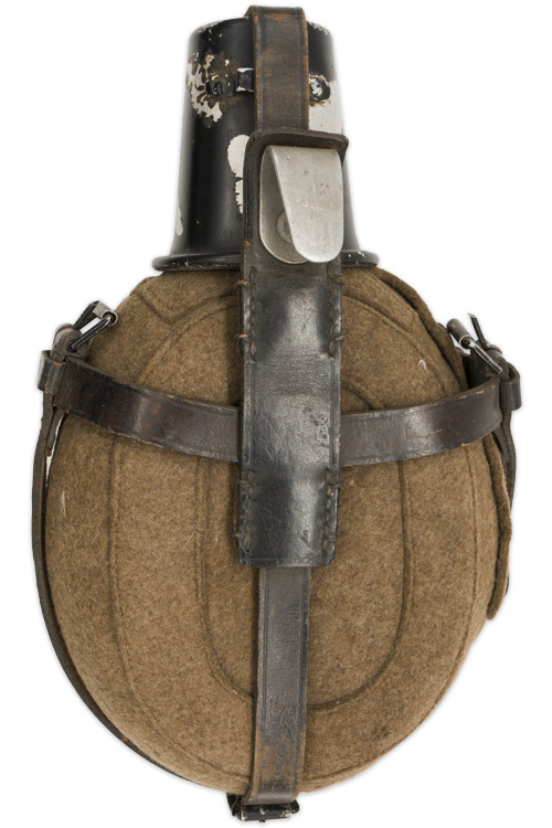 PHYSICAL DESCRIPTION: Standard issue, 1 1/2 liter capacity, tooled natural aluminum construction mountain troops and medical personnel’s canteen with a black painted, tooled, aluminum cup and a blackened leather harness with alloy fittings. The roughly, 8 3/4" tall, 6 1/2" wide, 3 1/4" thick, vertically oval, tooled, natural aluminum construction canteen is contained in a slightly mottled, brownish felt cover with four, black painted, alloy, closure snaps, machine stitched seams and a multi-piece, vertical and horizontal blackened leather carrying harness. The blackened leather harness consists of four, vertical, straps with one positioned to the center of both the obverse and reverse and one to each side. The four, vertical, straps are all stitched to a fifth, horizontal, strap situated just below the throat of the canteen. The vertical straps to the obverse and sides all have a blacked painted, pronged, alloy, roller buckles while the vertical strap to the reverse was designed to secure the cup to the top of the canteen with the pronged roller buckle on the obverse. The reverse, vertical strap also has an additional cap retaining strap, rivetted onto the screw off canteen cap and a rivetted on alloy belt support hook. The buckles to the vertical, side, straps were to secure the separate, detachable shoulder strap. The separate, detachable shoulder strap is absent. All four vertical straps have an additional, blacked painted, pronged, alloy roller buckle where the straps overlap at the bottom center of the canteen. The canteen has a tooled, natural aluminum, screw on cap with vertical ribbing to the top edge and a, rivetted on, leather retaining strap all intact. The canteen comes complete with a black painted, tooled aluminum construction, 1/4 liter capacity cup. The roughly, 3" tall, vertically, cylindrical, cup has a 3" x 2 3/4" outwardly fluted, oval mouth with a rolled back lip to the top edge, a raised, brazed on, strap retaining bracket to the obverse and a 1 3/4" diameter bottom. The cup retains about 55% of its black paint with large spots of wear to the base aluminum. The body of the canteen, has the impressed date, "29" but the canteen and all the components have no visible manufacturer’s markings. The canteen and cover are in overall fairly good condition with minor age and usage toning but the leather straps have stiffened with age and show some light surface cracking.